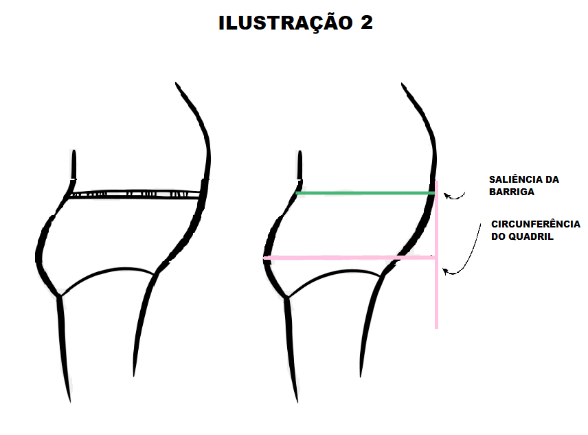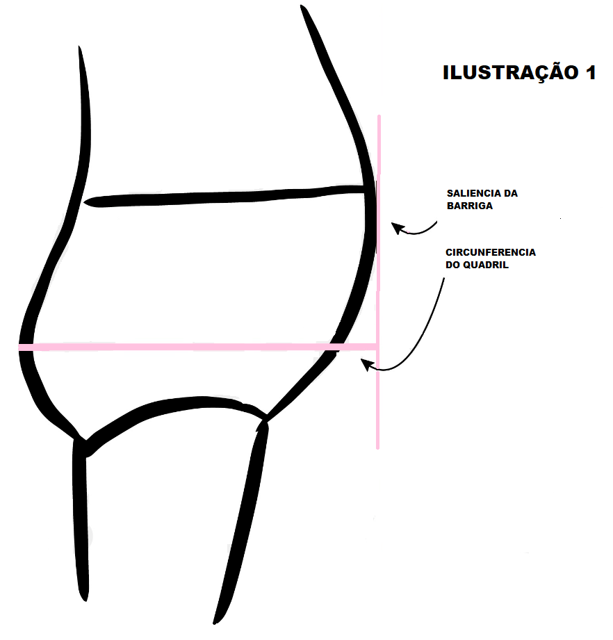Opção 2: Se um cinto for usado em volta da barriga saliente em uma peça de baixo, então o tamanho é escolhido de acordo com a medida do quadril mais a saliência da barriga. A cintura é medida exatamente onde o cinto é usado.